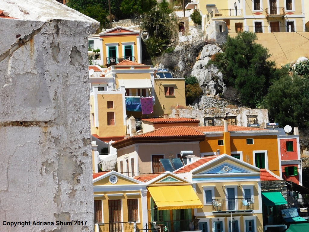 | The view from the Symi Visitor Accommodation office at midday today. Still not much yachting activity but the only day trip boat from Rhodes still missing is the Symi Sea Dreams. |